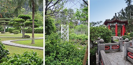 第七天我們參觀了士林官邸,蔣介石曾經(jīng)居住過的地方。士林官邸位于臺北市士林區(qū)福林路,目前是臺北市座生態(tài)公園。園內(nèi)景觀自然,提供市民親近綠地和休閑的去處,花園內(nèi)有豐富的動植資源,讓您觀賞各式草生昆蟲,和享受席地而坐、聆聽不拘形式的音樂饗宴。進(jìn)入園內(nèi)有一座咖啡館,晴朗的天氣很多人都坐在咖啡館門口的露天吧區(qū)內(nèi)休憩閑談,我們參觀的當(dāng)日天氣陰霾,游客很少,遠(yuǎn)遠(yuǎn)地我看見了咖啡館的招牌,那是一張很大的黑白照片,照片上身穿婚紗的宋美齡和西裝革履的蔣介石含笑相依,這是1927年12月1日蔣介石與宋美齡在上海大華飯店舉行的世紀(jì)婚禮上的照片。 那場“世紀(jì)婚禮”震驚了當(dāng)時的舊中國,也使整個世界為之側(cè)目,進(jìn)入園區(qū)整個園區(qū)古樹參天,群花競秀,景色清幽。外花園種植著蔣介石與宋美齡喜愛的梅樹、玫瑰、芒果、楊桃等花木,是二人挽手散步的好去處。 被鐵欄圈住的內(nèi)花園,假山奇石圍繞水池,池旁有個一人多高的大鳥籠,當(dāng)年曾飼有文鳥、小黃鶯等常見鳥類。謝導(dǎo)說,蔣介石愛臨池觀魚,自稱“愛養(yǎng)魚勝過釣魚”。池子后面的兩層瓦頂水泥洋房是正館,外墻漆成深綠色,與背后的青山綠樹融為一體。溫室盆栽區(qū)及玫瑰園,是蔣夫人喜愛的花園;西式庭園中浪漫美好的風(fēng)光,是新人婚紗照常取景的地方;中式庭園里的拱橋、曲池、流水等東方庭園造景,則令人彷佛置身古代中國。其它如園藝館、新蘭亭、凱歌堂等等,都是十分具有特色的建筑。平心而論士林官邸樸素優(yōu)雅,美觀大方,或許還有些拙。但在當(dāng)時實(shí)屬難能可貴,俗話說“一滴水能折射太陽的光芒”,管窺一斑,感受蔣介石和宋美齡的生活。